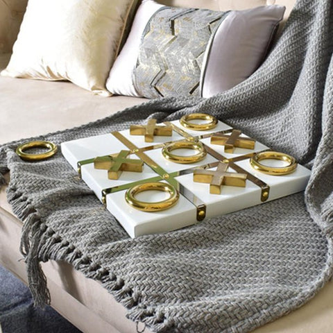 The stunning Jeux Tic-Tac-Toe Game combines modern and classic style.  Featuring solid painted wood embossed with stainless steel X and O game pieces and durable iron borders.  Our handcrafted set will bring elegance to any table top display.